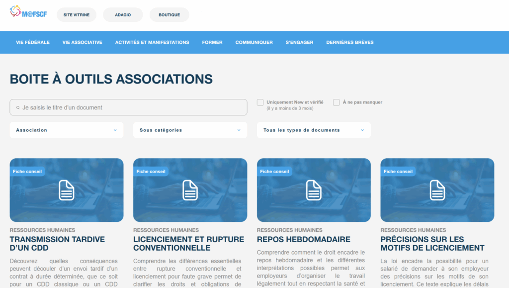 - Un espace « Conseil » avec des fiches pratiques, modèles de documents et ressources réglementaires sur des thématiques comme la gestion financière, les ressources humaines ou le cadre juridique.