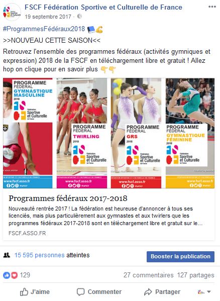 Facebook est le réseau social qui regroupe le plus grand nombre de licenciés FSCF. Avec plus de 8 500 personnes aimant sa page, la fédération possède un puissant outil de communication digitale qui lui permet d’être bien visible.