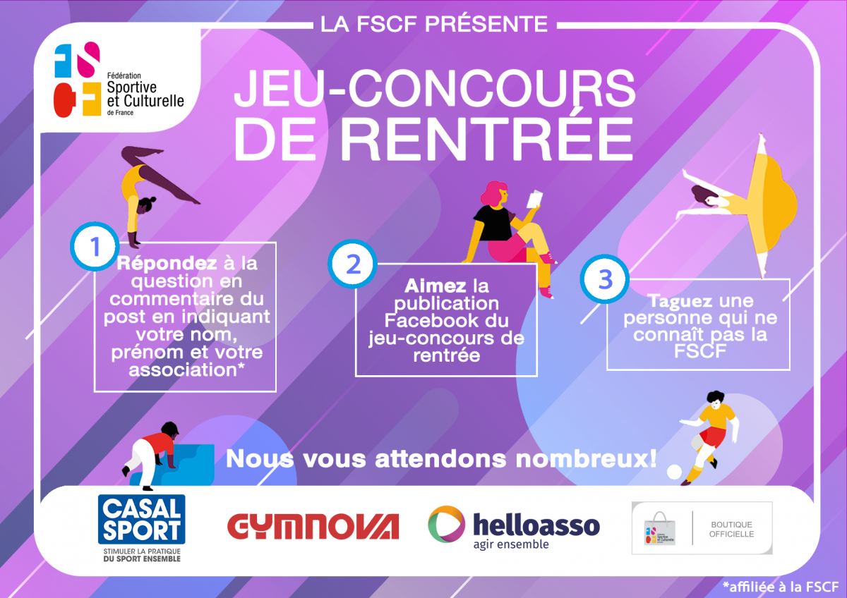 - commentez le post du jeu-concours en indiquant la bonne réponse à la question, votre nom et prénom (si votre pseudo Facebook est différent) et le nom de votre association (affiliée à la FSCF),