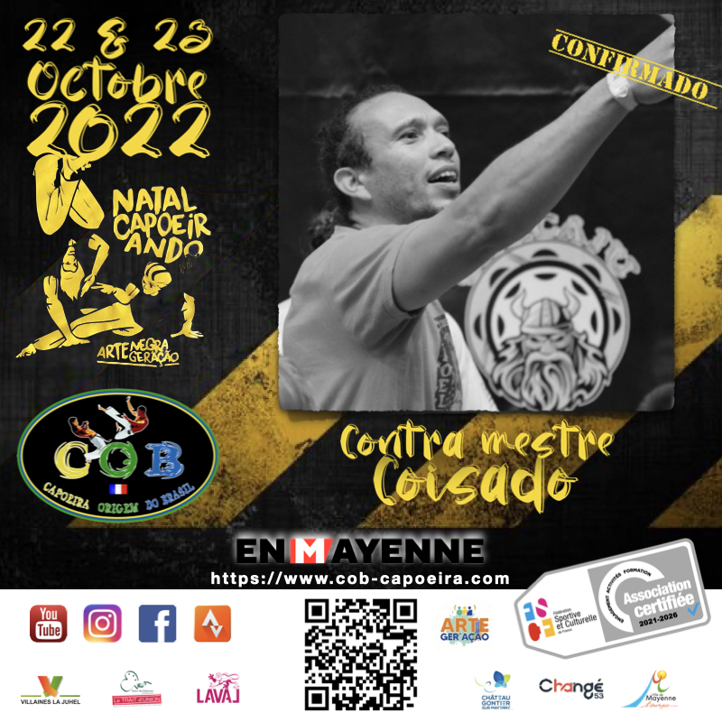 Le COB organise à Villaines-la-Juhel avec Contramestre Cacique du groupe Arte Negra et de nombreux invités pour un week end plein d’émotions, des stages de capoeira Angola et Régional, de la musique, de la danse, du chant, roda et une soirée avec un spectacle.