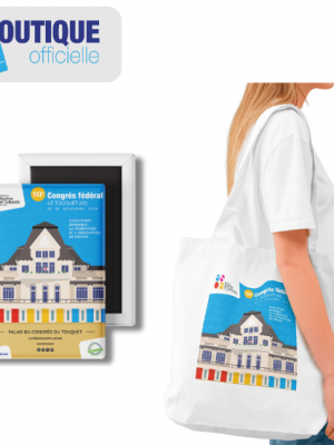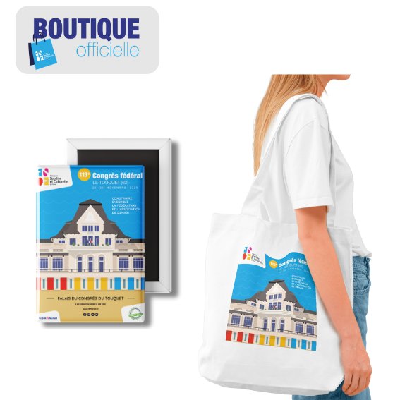 Profitez d'un duo exclusif rassemblant les deux indispensables du Congrès fédéral 2025 : le tote bag édition spéciale orné de l'affiche officielle de l'année et le magnet assorti, parfait pour conserver un souvenir durable de l'événement.